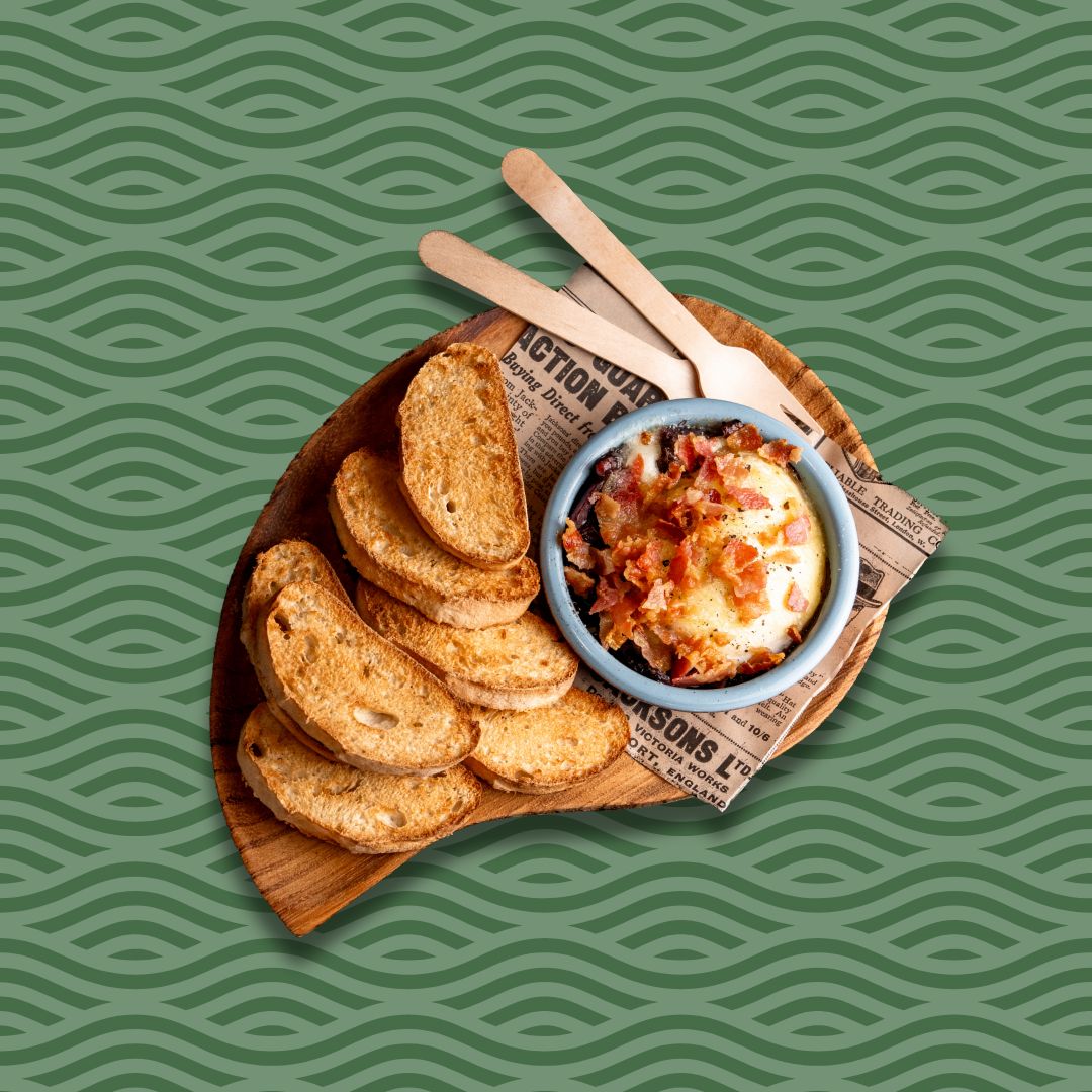 1 x breaded mozzarella, bacon rosti, salmon rosti, pulled pork morsel, smoked and spiced chicken skewer, vegan curry stick