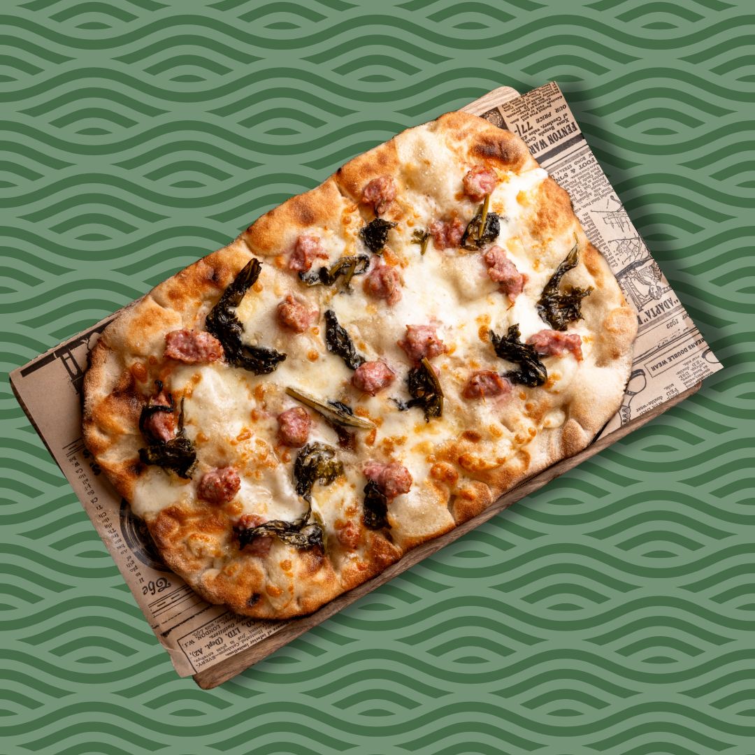 Pinsa topped with mozzarella, taleggio cheese, sausage, and friarielli