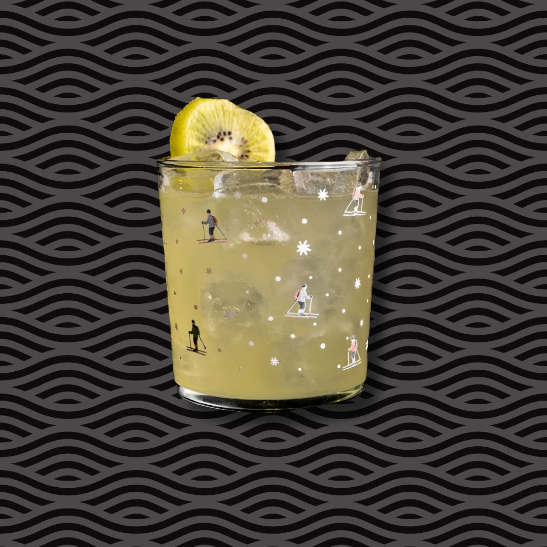 Gin Ginnastic, liquore al bergamotto, shrub al kiwi e sciroppo al frutto della passione.